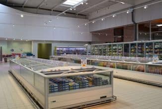 Die Tiefkühlzentrale von HK REFRIGERATION, Typ MOPSH 4N 6HE-28 besteht aus 4 halbhermetischen Hubkolbenverdichtern BITZER 6HE28Y. Sie wird für eine Kühlleistung von 50,4 kW bei Betrieb -36/42 °C berechnet. Diese Zentrale versorgt alle Tiefkühlbereiche (Kühlkammern und geschlossene Verkaufsmöbel). Um keinerlei Verluste der Handelsaktivitäten zu verursachen, werden die Schränke nach einander in Betrieb genommen.