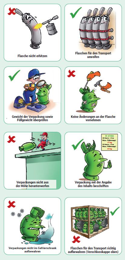 - Vor dem Umgang mit verflüssigten Gasen ist es wichtig, das technische Datenblatt und das Sicherheitsdatenblatt des Produkts zu konsultieren (kostenlos erhältlich unter www.quickfds.com).