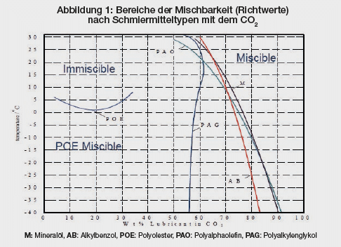 Der Ölfilm auf den Zylinderwänden eines Kolbenverdichters wird beim Ansaugen niedrigen Temperaturen ausgesetzt (zum Beispiel – 42°C bei einem Saugdruck von 9,3 bar abs.) und höheren Temperaturen an den Auslassventilen (zwischen 50 und 75°C je nach Betriebsart). Da die Viskosität mit steigender Temperatur abnimmt, ist die Viskosität des Schmiermittels im Ansaugbereich viel höher als im Auslassbereich. Somit ergeben sich zwei entgegengesetzte Effekte: Die Viskosität des Öls darf einerseits nicht zu hoch sein, damit sich das Öl schnell als feiner Film auf alle Flächen, die geschmiert werden sollen, verteilen kann; andererseits muss eine ausreichend hohe Viskosität gegeben sein, damit das Schmiermittel trotz der Löslichkeit des CO2 ausreichend Schutz gegen Verschleiß bietet. Darüber hinaus muss berücksichtigt werden, dass das Öl über das Kältemittel in das System gelangt, sodass der Faktor Mischbarkeit schließlich sehr wichtig wird, wie ich später erklären werde.