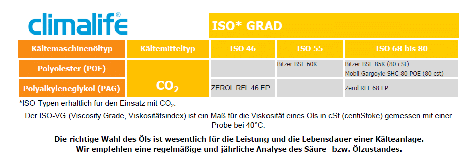 Falls eine ISO 68-Qualität für die meisten halogenierten Kältemittel geeignet ist, muss bei Verwendung von POE-Ölen mit CO2 eine höhere ISO-Qualität verwendet werden, um den erheblichen Viskositätsabfall des Öls in Kontakt mit R-744 zu lindern. Eine ISO-Klasse über 80 ist daher besser geeignet. Das Schmiermittel kann so eine ausreichende Viskosität beibehalten, um die Teile des Kompressors zu schützen.
