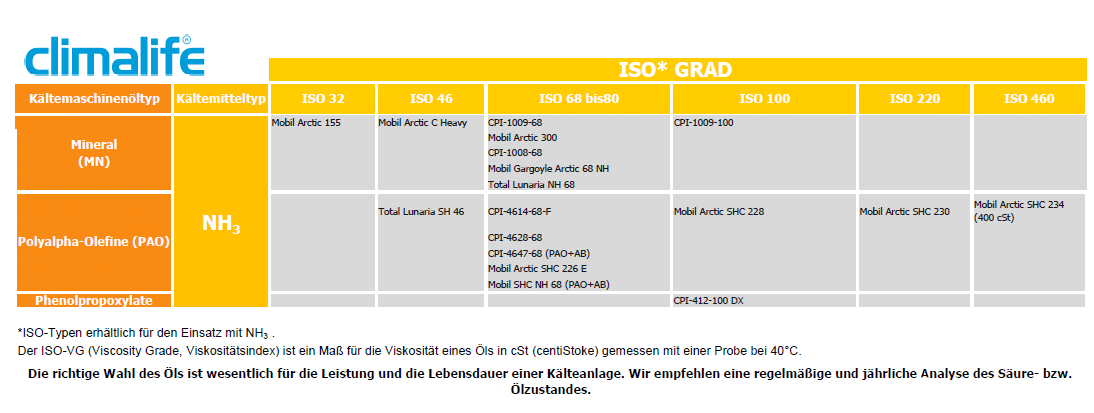 Wenn das Kühlaggregat für den Betrieb mit mischbaren Schmiermitteln ausgelegt ist, so sind, im Falle von CO2, mineralische oder synthetischen PAO- und AB-Schmierstoffen nicht geeignet.