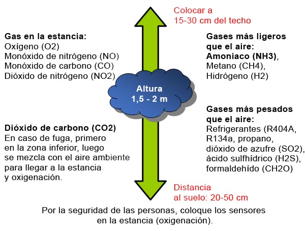 Para gases explosivos o peligrosos, el umbral de detección está fijado en menos del 20 % del límite inferior de inflamabilidad. Los detectores de amoniaco además deben activar la ventilación, una alarma y desconectar la alimentación externa.