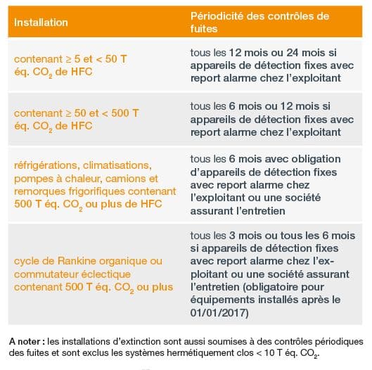 Déjà stipulés dans le cadre de la F-Gas I pour les installations ayant une charge de plus de 300 kg, les contrôleurs d’ambiance (détecteurs fixes) sont désormais obligatoires dans le cadre de la révision de la F-Gas (règlement UE 517/2014 dit F-Gas II- articles 4 et 5) pour les installations ayant une charge supérieure à 500 T. éq. CO2.