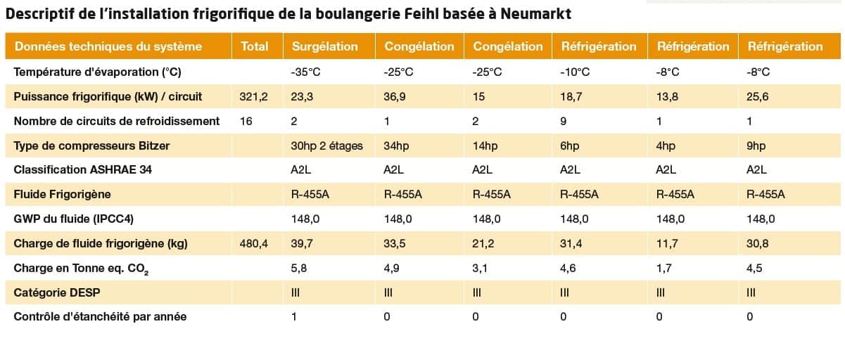 480 kg de Solstice® L40X sont chargés au total dans les différentes unités qui alimentent 2 surgélateurs avec une température d’évaporation à -42 °C, les 3 congélateurs à -28 °C et 11 cellules de refroidissement à -8 °C / -10 °C. L’installation est équipée d’évaporateurs et de condenseurs spécialement sélectionnés par le fabricant Güntner qui permettent de gérer sans aucune difficulté le glissement de température du R-455A. Le process de refroidissement pour assurer la pousse du pain est d’environ 24 heures. Ce process s’effectue à une température de +/-0 °C et est entièrement automatisé. Der Backer Feihl est reconnu sur le marché pour son process unique de production et sa faible teneur en gluten dans l’ensemble de ses pains.