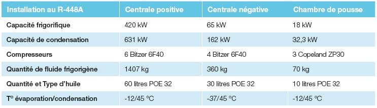 La centrale pour le froid positif, composée de 6 compresseurs semi-hermétiques Bitzer 6F-40, était chargée avec 1300 kg de fluide frigorigène R-404A. La production de froid négatif quant à elle, est assurée par une centrale de 4 compresseurs (350 kg de R-404A), identiques à ceux de la centrale positive.