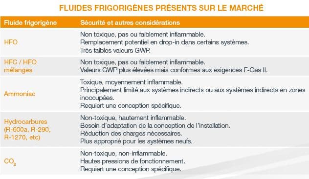 des produits particulièrement dangereux, difficiles à maîtriser ou peu performants (NH3, SO2, CCl4, H2O, …) avec pour objectif principal la conservation des denrées. Puis les législations successives ont bousculé le marché et il a fallu trouver des solutions techniques viables et facilement applicables pour pérenniser les systèmes encore en parfait état. Nous avons connu le remplacement des CFC par des HCFC, puis les HCFC par les HFC et aujourd’hui c’est celui des HFC par des HFO et autres technologies. Tout changement est source d’opportunités et d’innovations pour l’ensemble des acteurs de la profession. L’industrie de la thermodynamique doit s’adapter en conséquence et assez rapidement. On ne peut pas attendre la date fatidique de 2020 pour réagir, il sera trop tard !