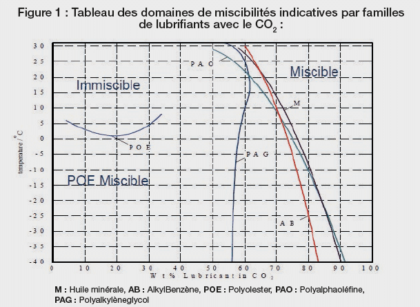 Comme la viscosité décroît avec la température, le lubrifiant verra sa viscosité beaucoup plus élevée au niveau de l’aspiration qu’au niveau de la décharge. Nous sommes donc face à deux effets antagonistes : la viscosité de l’huile ne doit pas être trop élevée pour s’étendre rapidement en un film fin sur l’ensemble des surfaces à lubrifier, mais doit être suffisamment élevée pour que, malgré la solubilité du CO2, le lubrifiant apporte une protection adéquate contre l’usure. Il faut également tenir compte de l’entraînement de l’huile par le fluide frigorigène au-delà du compresseur, la notion de miscibilité sera alors très importante comme expliquée plus loin.
