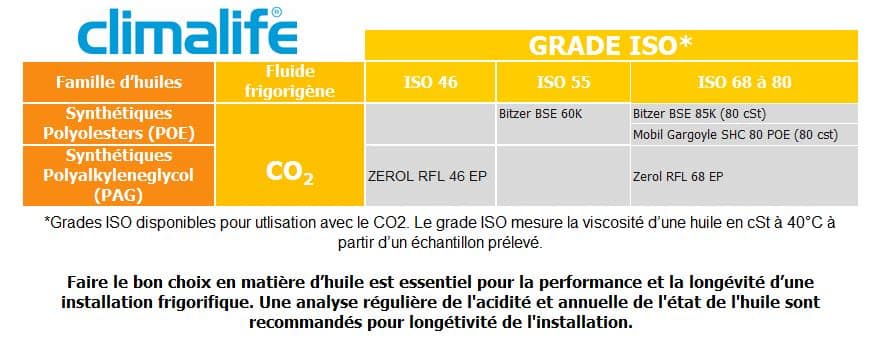 Là où un grade ISO 68 convient pour la plupart des fluides frigorigènes halogénés, l’utilisation des huiles POE avec le CO2 nécessitera un plus haut grade ISO qui permettra de palier à la chute importante de viscosité que connaît l’huile au contact du R-744. Un grade ISO supérieur à 80 sera donc plus adapté, et le lubrifiant pourra ainsi conserver une viscosité suffisante pour protéger les pièces du compresseur.