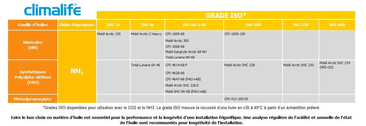 L’ammoniac est communément utilisé avec les huiles minérales parraffiniques et naphténiques, les synthétiques PAO et AB. Un grade ISO 68 est généralement utilisé en application industrielle pour sa chute de viscosité quasi-inexistante.