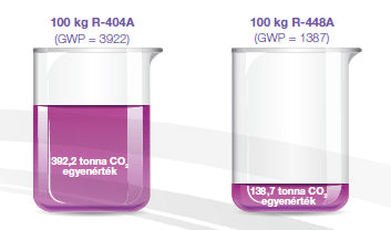 A.L.D. : Fontos megérteni, hogy az említett szabályozás célja a globális felmelegedésre gyakorolt hatás csökkentése. Az új tonna CO2-egyenérték mechanizmus (amely a hűtőközegtöltet kg-ban mért mennyiségének és GWP-jének szorzata) használatával a gyártóknak és az importőröknek egyértelműen választaniuk kell az elkövetkezô években a forgalomba hozott termékek mennyiségét illetően. Ez azt jelenti, hogy ha egy gyártó vagy importőr 100 kg 3922 GWP-jű R-404A-t hoz forgalomba, akkor ezzel 392,2 tonna CO2-egyenérték mennyiséget használ fel a kvótájából. Amennyiben alacsonyabb GWP-jű terméket hoz forgalomba, például az 1387 GWP-jű R-448A-t, akkor ezzel csak 138,7 tonna CO2-egyenértéket használ fel. Figyelembe véve a 2018-ra előirányzott nagy „phase down” lépést, vagyis a piacon lévő HFC-k tonna CO2 egyenértékben kifejezett 37%-os csökkentését, a magas GWP-jű termékek, így például az R-404A, az R-507A, stb. elérhetôségének jelentős mértékű csökkenésére kell számítanunk. Az említett termékek kínálata az elkövetkező három évben jelentősen szűkülni fog, még jóval a 2020-as kivezetésük előtt.