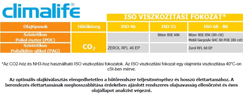 Annak ellenére, hogy a legtöbb halogénezett hűtőközeg esetén az ISO 68-as fokozat megfelelő, a POE-olajok CO2-vel történő felhasználása magasabb ISO-fokozatot igényel, amely kompenzálja az olaj jelentős viszkozitáscsökkenését az R-744-gyel való elegyedésekor. Ezért a 80-nál magasabb ISO-fokozat az alkalmasabb és a kenőanyag elegendő viszkozitást tart fenn a kompresszor alkatrészeinek védelme érdekében.