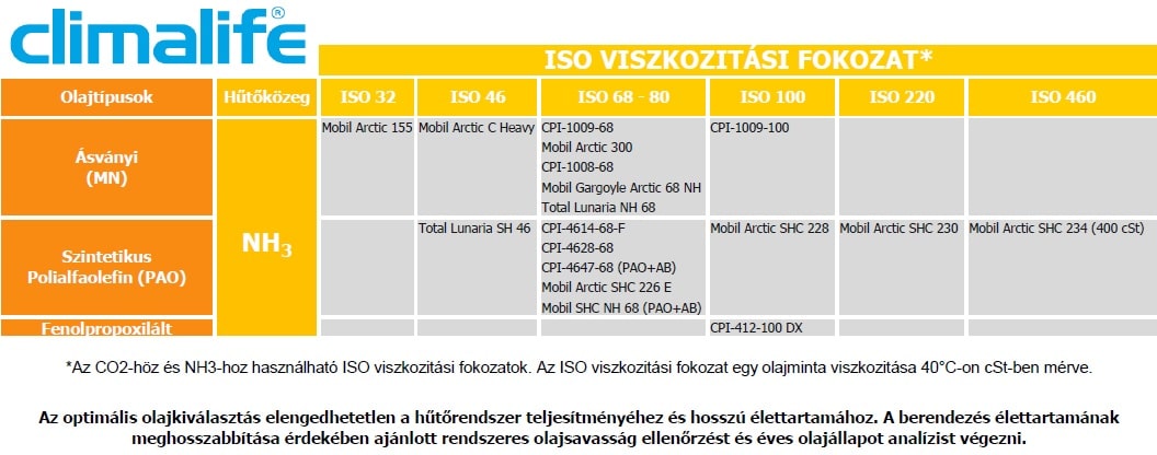 Az NH3-mal működő kompresszorok magas minőségű olajat igényelnek, a következő kritériumok betartásával: