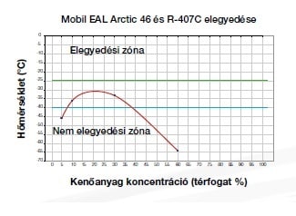 A piros színű görbe meghatározza a Mobil EAL Arctic 46 és az R-407C hűtőközeg oldhatósági zónáját a keverék kenőanyag koncentrációja alapján. Az említett görbe alatt két, egymással nem elegyedő fázis található meg. Az említett görbe felett a kenőanyag és a hűtőközeg egyetlen fázist alkot. Számszerű alkalmazás: – 25°C-os hőmérsékleten (zöld vonal) a Mobil EAL Arctic 46 és az R-407C hűtőközeg csak egyetlen fázist alkot, a Mobil EAL Arctic 46 koncentrációjától függetlenül. – 40°C-on (kék vonal): Egyetlen fázis 7,5%-nál alacsonyabb Mobil EAL 46 koncentráció esetén, míg 2 nem elegyíthetô fázis 7,5 és 38% közötti Mobil EAL 46 koncentráció esetén, valamint 38%-os Mobil EAL 46 koncentráció felett egyetlen fázis.