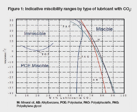 J-YC/FP: Refrigeration by compression is based on the well-known principle of vaporization, whereby the refrigerant transforms from a liquid to a gaseous state, a process during which a large amount of heat is absorbed, resulting in “cold production”. Although this basic principle does not change, numerous variants are used in industrial facilities operating with CO2, such as cascade systems, dry or flooded evaporators, boosters, and sub or transcritical refri-gerant cycles. The refrigerant gas and the design of the facility are what will determine the type of lubricant needed. Thus, for a facility requiring a perfect miscibility between the CO2 and the lubricant, one would use POE type oils (polyolesters), whereas for systems that do not favour miscibility, one would rather use a PAO (polyalphaolefin) or PAG (polyalkylene glycol) lubricant, as shown in Figure 1.