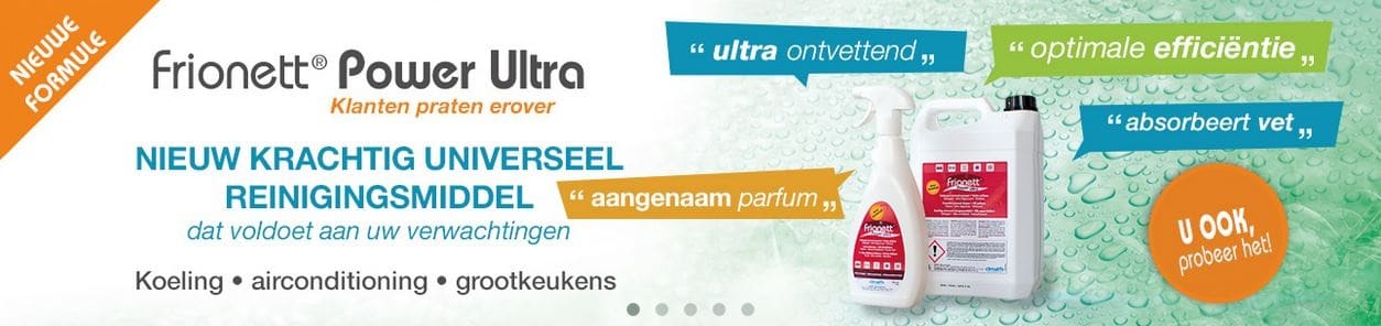 Zijn reinigende en ontvettende kracht verwijdert vlekken, vet en andere verontreinigingen en zorgt voor een optimale warmte-uitwisseling van de warmtewisselaars waardoor het rendement van de installatie wordt hersteld. Frionett® Power Ultra is beschikbaar in een gebruiksklare variant van 750 ml en de 5 liter geconcentreerde variant, moet worden verdund.