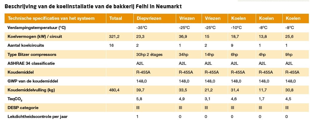 480 kg Solstice® L40X wordt gevuld in de verschil­lende eenheden. Deze voeden 2 diepvriezers met een verdampingstemperatuur van -42°C, 3 vries­kisten van -28°C en 11 koelcellen van -8°C/ -10°C. De installatie wordt voorzien van verdampers en condensors die speciaal werden geselecteerd door de fabrikant Güntner en waarmee de temperatuur­schommeling van de R-455A probleemloos kan worden beheerd. Het koelproces voor het rijzen van het brood duurt ongeveer 24 uur. Dit proces vindt plaats bij een temperatuur van +/-0°C en is volledig geautomatiseerd. Der Bäcker Feihl is gekend op de markt voor zijn unieke productieproces en laag glu­tengehalte in al zijn broden.