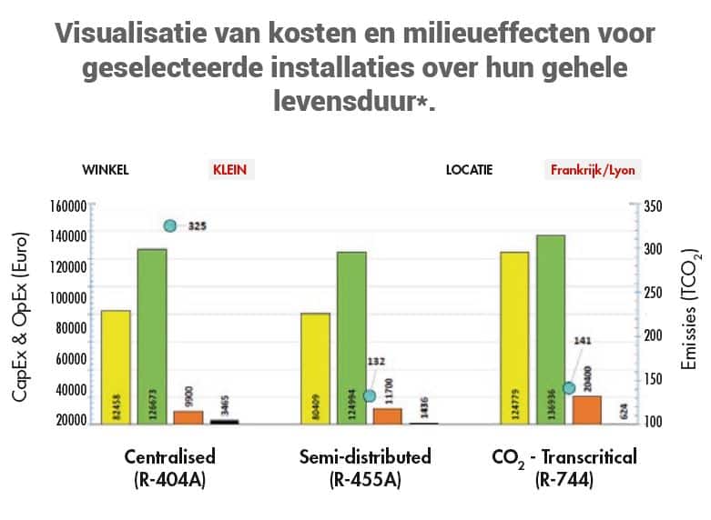 Onze technische ondersteuning help u met onze thermodynamische modellering het beste koudemiddel te kiezen, waarbij u met de eco-efficiëntiemodellering meer gedetailleerd kan vergelijkingen zoals: elektriciteitsverbruik, CO2-voetafdruk in TCO2e, investerings- en onderhoudskosten. De tool bevat criteria zoals prijsschommelingen (elektriciteit, koudemiddel, enz.), koolstofbelasting (indien van toepassing), het gemiddelde lekpercentage voor de installatie, enz.