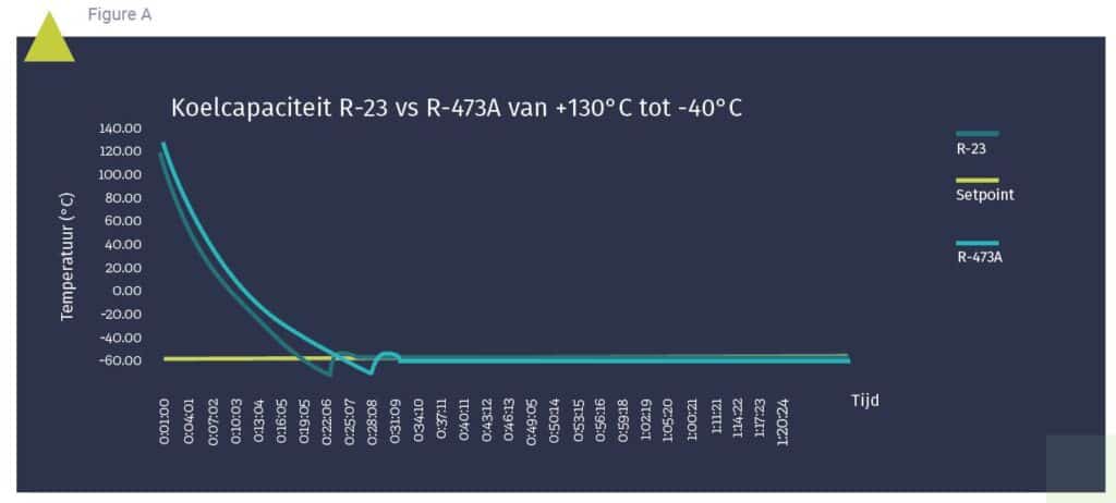 SJJ voerde een eerste onderzoek uit en startte vervolgens een reeks zorgvuldig gecontroleerde tests om de bruikbaarheid van Klea 473A te beoordelen als een zeer lage GWP-oplossing voor de klimaat testkamers. Uit de tests bleek dat Klea 473A vrijwel gelijkwaardig presteert ten opzichte van R-23, zie figuur A, met slechts een kleine aanpassing van het expansieventiel. Klea 473A is een toekomstbestendig koudemiddel met een zeer laag GWP voor ultralage temperaturen, tot -75 °C en heeft de volgende voordelen: