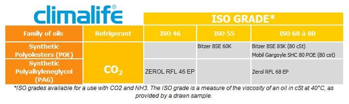 Acolo unde este convenabil gradul ISO 68 pentru majoritatea refrigeranţi, utilizarea uleiurilor POE împreună cu CO2 va necesita un grad ISO mai ridicat, care să permită lubrifierea în cazul scăderii substanţiale a vâscozităţii, pe care o prezintă uleiul la contactul cu R-744. Astfel, un grad ISO mai mare de 80 va fi mai indicat, lubrifiantul putând astfel să-şi menţină o vâscozitate suficientă pentru a proteja piesele compresorului.