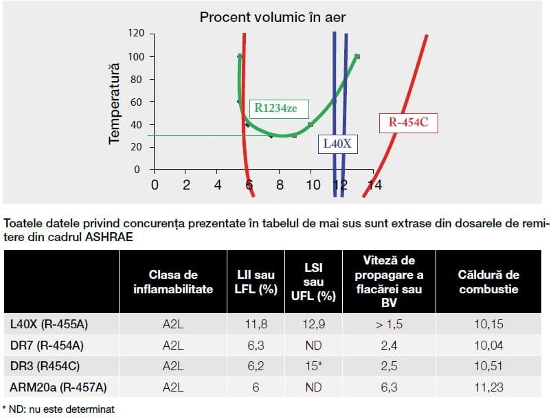 JDB : În compoziţia Solstice® L40X (R-455A), există 3 % CO2. L-am adăugat cu scopul de a mări capacitatea refrigerantului şi de a-i reduce inflamabilitatea. Dacă observăm intervalul de inflamabilitate definit între limita inferioară şi cea superioară de inflamabilitate, există o diferenţă de doar 1,1 % (v. curba albastră din graficul de mai jos). Aşadar, există puţine riscuri de a ne regăsi în această situaţie şi dacă este cazul, combustia din aer va determina ieşirea amestecului din această zonă de inflamabilitate foarte repede. La nivel global, se constată că HFO sau amestecurile HFC/HFO, din clasa A2L, au tendinţa de a securiza sistemele, comparativ cu hidrocarburile din clasa A3. Alt exemplu: este necesară o concentraţie de 10 ori mai mare şi de aproximativ 250.000 ori mai multă energie pentru a aprinde R-1234ze, comparativ cu propanul. HFO au un viitor promiţător! Tendinţa de înlocuire a refrigerantului R-404A a apărut deja, nu o rataţi, ci adoptaţi-o chiar acum!