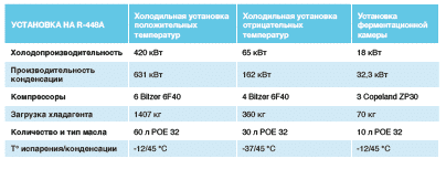 Установка для выработки холода положительных температур , состоящая из шести полугерметичных компрессоров Bitzer 6F-40, была заправлена 1300 кг хладагента R-404A. Производство отрицательного холода обеспечивала установка из четырех таких же компрессоров (350 кг R-404A).