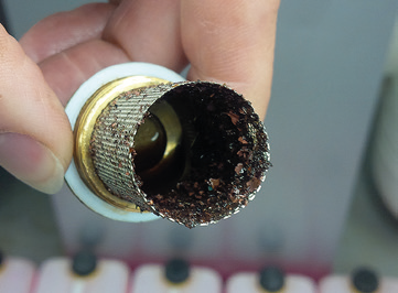 Осматривая систему, инженер обнаружил, что жидкий теплоноситель (на основе монопропиленгликоля), изначально использовавшийся в гелиоконтуре, разложился и превратился в гудронированный липкий осадок. Такие проблемы иногда возникают, когда в здании никто не живет, но оно продолжает принимать солнечную энергию. Поскольку расход тепла отсутствует, система закрывает насос, и температура жидкого теплоносителя последовательно повышается, пока он не начинает разлагаться. В этом конкретном случае было установлено, что воздухоотводчика, использовавшегося после установки системы, оказалось недостаточно, и что теплоноситель стал стагнировать из-за наличия воздушных пробок. Именно поэтому насос оказался неэффективным.